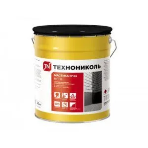 Гидроизоляционная мастика №24 «Технониколь» содержит в составе битум в сочетании с растворителем, минеральными веществами и специальными добавками. Данная формула обеспечивает готовый материал высокими эксплуатационными свойствами. Материал предназначается для выполнения обмазочных обработок различных поверхностей с целью их защиты от воздействия влажной среды. Она предупреждает образование коррозии на металлических конструкциях. Может использоваться для скрепления листовых материалов, используемых при выравнивании полов.